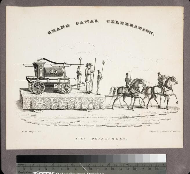 Image of a side view of a parade float drawn by four horses with a driver, two firefighters, including one with an ax and the other the pipe, and a hand-pump manual fire engine labeled "Washington 20" on the platform; the image depicts a float in the Grand Canal Celebration celebrating the opening of the Erie Canal in New York City on November 4, 1825.