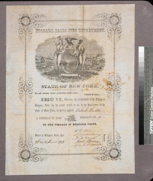 Niagara Falls Fire Department. State of New York. To all whom these presents shall come, ... do hereby appoint Walter C. Hulett a fireman in Fire Company No. 2