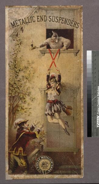 Image of a man wearing suspenders with a collared button-down shirt with tie and pants with front and back views in two panels; ornamental gold framing around panels and printed text; bust in three-quarter view of a North American Indian man wearing a feathered headdress in small circular frame at bottom center.