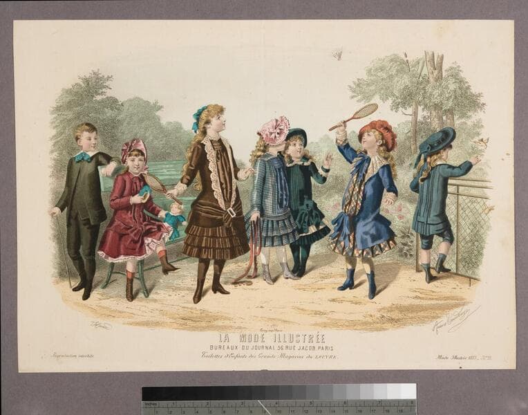 Image of a several children playing with various toys outdoors, including a kite, a model ship, and a badminton set; fashion details include full knee-length dresses for girls with gathers, pleats, ribbons, and lace, coats and mantles, and sailor-inspired suits for boys with breeches and hose; accessories include shoes with buttons, bows, or laces, straw, feathered, and fur hats, gloves, and hair ribbons.