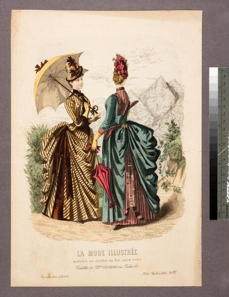 Image of two women outdoors featuring current dress fashions; fashion details include long bustled skirts with prominent ruffles, gathers, and draped overskirts, lace inset underskirt, fitted bodices, and banded, embroidered, and ribbon detailing; accessories include gloves, a fan, parasols, and hats trimmed with flowers.