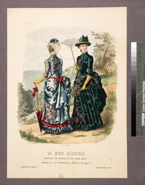 Image of two women outdoors featuring current dress fashions; fashion details include long bustled skirts with prominent ruffles, gathers, and draping, fitted bodices, patterned fabric, and ribbon detailing; accessories include gloves, a fan, parasols, and hats trimmed with flowers and ribbons; mountains visible in background.