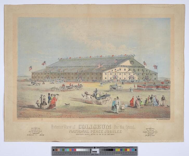 Image of a large exhibition building for the National Peace Jubilee in Boston, Massachusetts, with three smaller ticket booths along one side; people stream towards the building, arriving on foot, in horse-drawn vehicles, and on horseback.