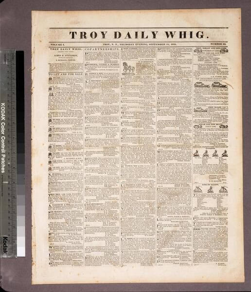 Image of an eye-level view of the Howe Machine Company's sewing machine factory in Bridgeport, Connecticut, from across the water showing a sailboat and an Elias Howe Jr. steamboat ferry, horse-drawn carriages, and an American flag in foreground; coin with profile of Elias Howe, Jr. pictured at bottom center.