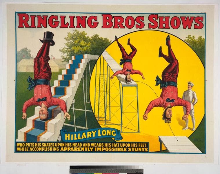 Ringling Bros shows : Hillary Long who puts his skates upon his head and wears his hat upon his feet while accomplishing apparently impossible stunts