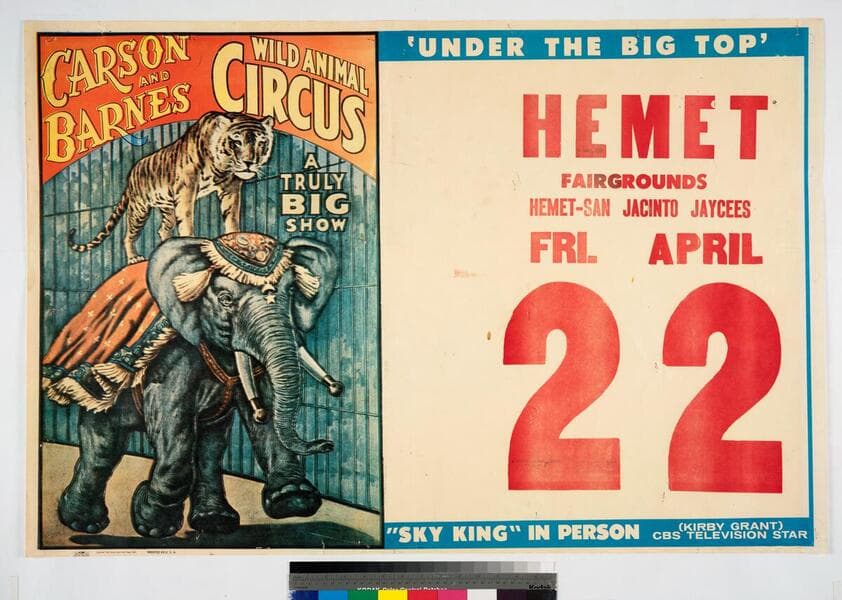 Image of a circus menagerie with spectators viewing fenced and caged animals including elephants, hippopotamus, polar bears, ostriches, seals, and zebras; with text advertising an April 22, [1966], show in Hemet, California.