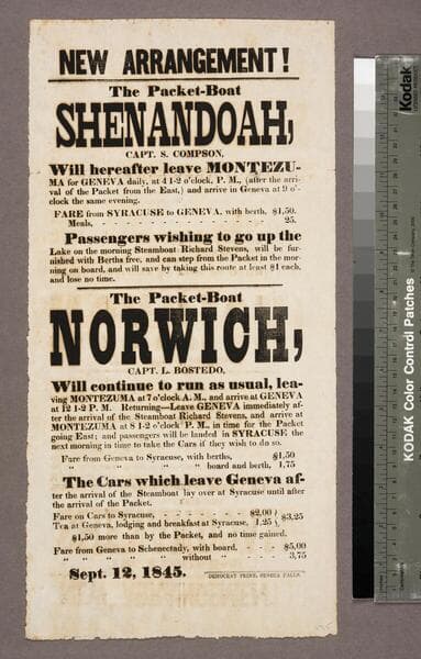 - Image of a broadside advertising new routes for the steamboats Shenandoah and Norwich, with fares for travel between the cities of Montezuma, Geneva, Schenectady, and Syracuse, New York, including pricing with and without board and/or meals.