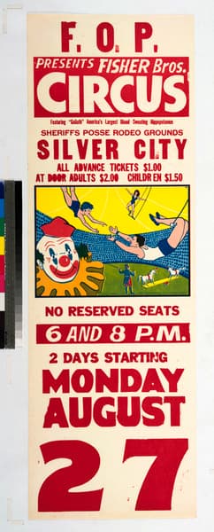 Image of a woman riding on an elephant with spotlights in background; with text advertising an August 27-28, [1973], show in Silver City, New Mexico.