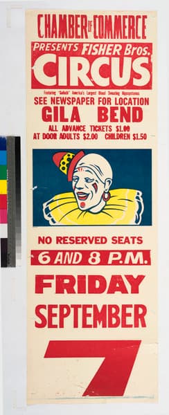Image of a whiteface clown, three aerialists, and a ringmaster and two circus horses performing under a circus tent; with text advertising an August 27-28, [1973], show in Silver City, New Mexico.