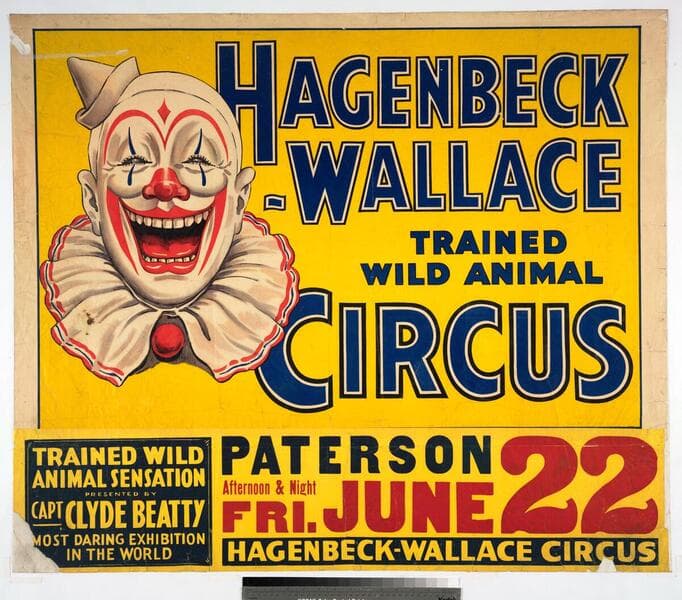 Image of the head of a laughing whiteface clown; date sheet for a May 10-11th show in Newark, New Jersey, pasted below image.