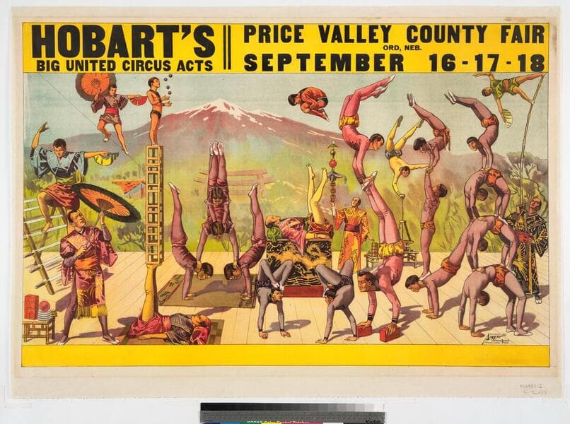 Image of Japanese aerialists, acrobats, and jugglers, some wearing kimonos, performing acts, with a lower left corner vignette of two men fighting with swords captioned "Exercices de Guerriers," and a lower right vignette of two men fencing, captioned "Escrime Japonaise"; small portrait of P.T. Barnum at upper left and small portrait of J. A. Bailey at upper right; with a French stamp and obscured Barnum and Bailey stamp at upper left.