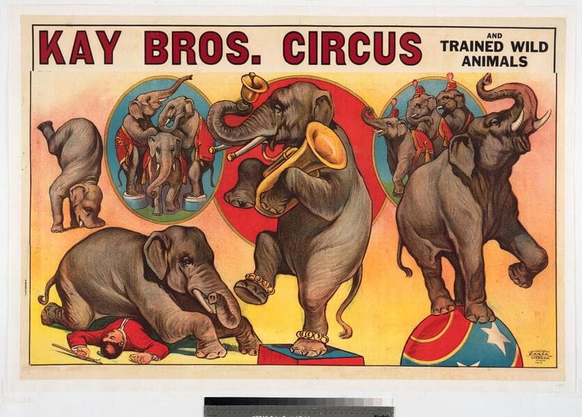 Image of elephants performing in circus rings, with elephants forming a pyramid led by an animal trainer in the foreground and elephants walking on their hind legs in background