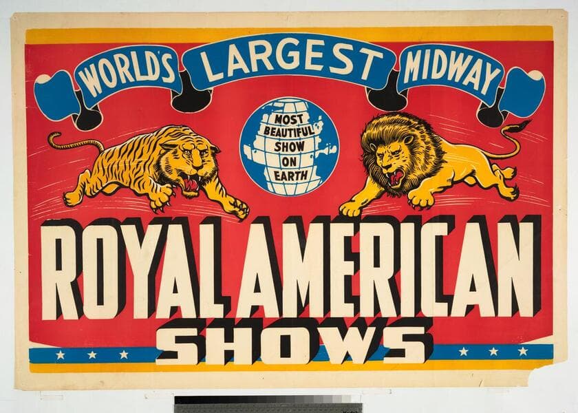 Image of an attacking tiger and attacking lion, each with teeth and claws bared, separated by the printed title; "The Greatest Show on Earth" globe logo at lower left.