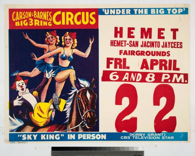 Image of a tiger riding on the back of an elephant before a cage wall in the right half of the poster; the left half of the poster contains text advertising an April 22, [1966], show in Hemet, California.