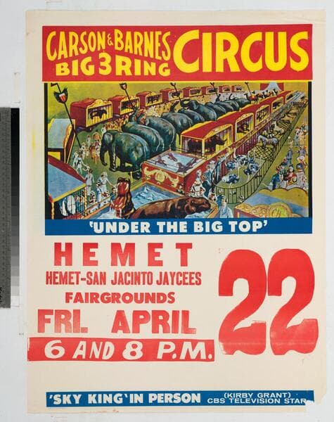 Image of two female circus performers and a clown atop a horse with text advertising an April 22, [1966], show in Hemet, California.