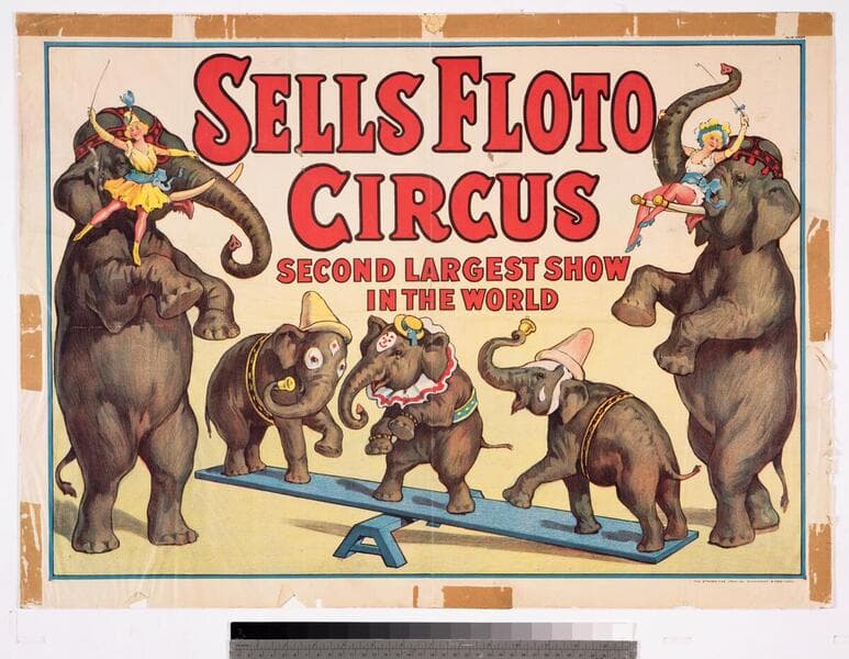 Image of elephants performing in circus rings, with elephants forming a pyramid led by an animal trainer in the foreground and elephants walking on their hind legs in background