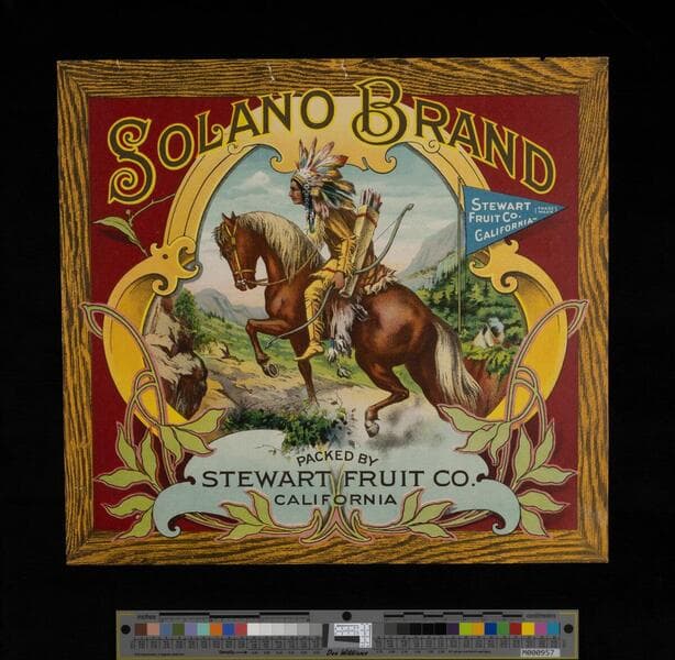- Image of a Native American man with headdress, bow, arrows and quiver riding a horse; teepees and mountains in background; Stewart Fruit Company blue flag logo at right.