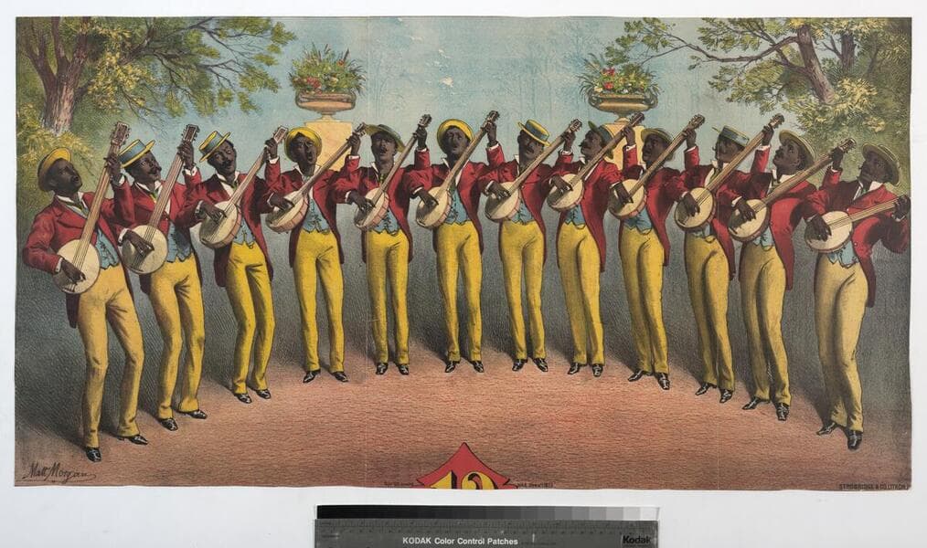 Image of a twelve-member male and female African American troupe posing in a row outdoors, with men in matching suits and women in matching dresses holding parasols.