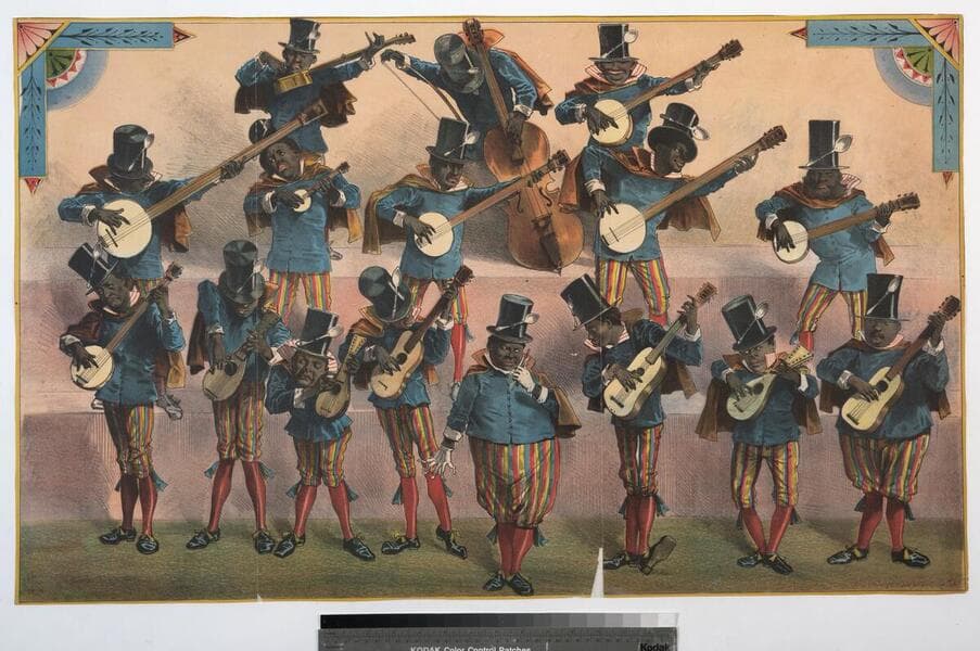Image of a central image of minstrel musicians in blackface dressed in formal suits sitting on a stage and holding musical instruments and surrounded by top and bottom vignettes of male and female minstrels dancing and performing skits in costumes; with three caricatures of performers at top of image.