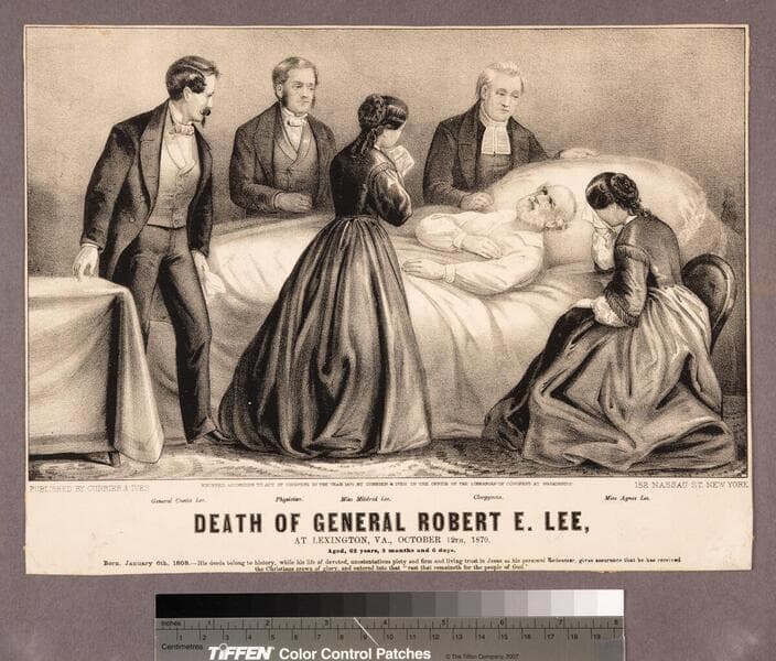 - Image of General Robert E. Lee on his deathbed in Lexington, Virginia, in 1870; his children General Custis Lee, Mildred Lee, and Agnes Lee mourn at his bedside while a physician and clergyman look on.