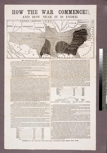 - Image of a partial map of the United States with shaded areas indicating Union and Confederate territory changes during the Civil War through late 1864; text published by the National Union Executive Committee printed below the map discusses the occurrences that shaped the beginning of the war, states and territories seized with area and population, and an outline of the war's progress.