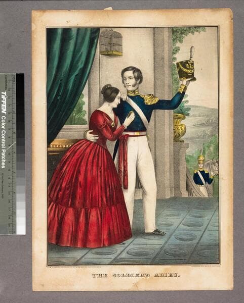 - Image of a soldier in uniform embracing a woman in a sad farewell with a plumed hat raised in his left hand; a second soldier with horse waits outside the door of the well-appointed home.