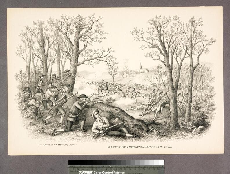 - Image of the Battle of Lexington, Massachusetts, in 1775 at the start of the American Revolutionary War; American militia shoot from cover in a wooded area at advancing British soldiers; wounded and dean men visible on battlefield; church building visible on a hill in background.