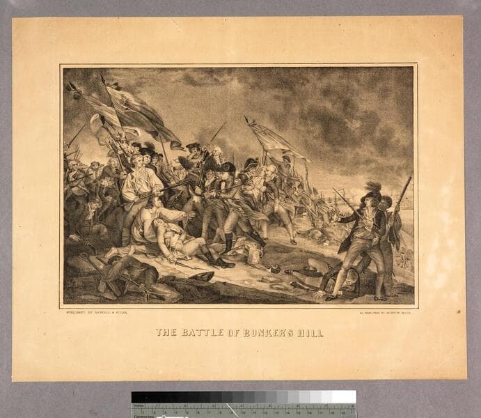 - Image of the Battle of Bunker Hill during the siege of Boston, Massachusetts, in 1775 at the start of the American Revolutionary War; British and American soldiers clash in a battle scene with flags raised and men fighting with swords and rifles; dead and wounded men litter the ground; ships firing in Boston Harbor visible in background at right.