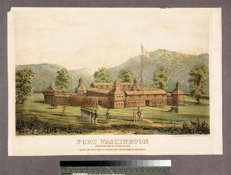 - Image of an eye-level view of Fort Washington in Cincinnati, Ohio; wooden fort structure with soldiers and a cannon visible outside; large American flag raised over the building; wooded hills in background.