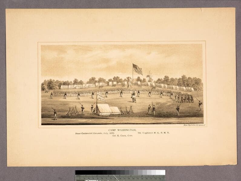 - Image of Camp Washington located near the grounds for the United States Centennial Exhibition in Philadelphia, Pennsylvania; soldiers of the 7th Regiment of the National Guard of the State of New York armed with rifles and bayonets shown assembled in the center of camp; large American flag flying on flag pole at center; tents and cannons surround the camp perimeter with wooded area in the background.