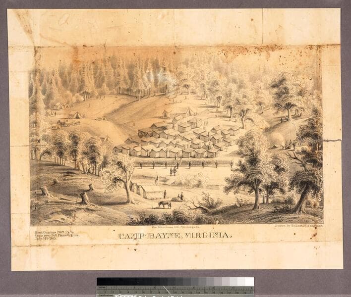 - Image of Camp Bayne during the American Civil War located near Bell Plains, Virginia, with tents erected in a clearing of a wooded area; long ranks of soldiers assembled at center; a few men, a cook fire, horses, and wagons are visible around the edges of the camp.