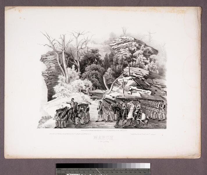 - Image of several ranks of Union soldiers during the American Civil War marching behind a military band and an officer on horseback directing them ahead; a large rock formation is visible in background.