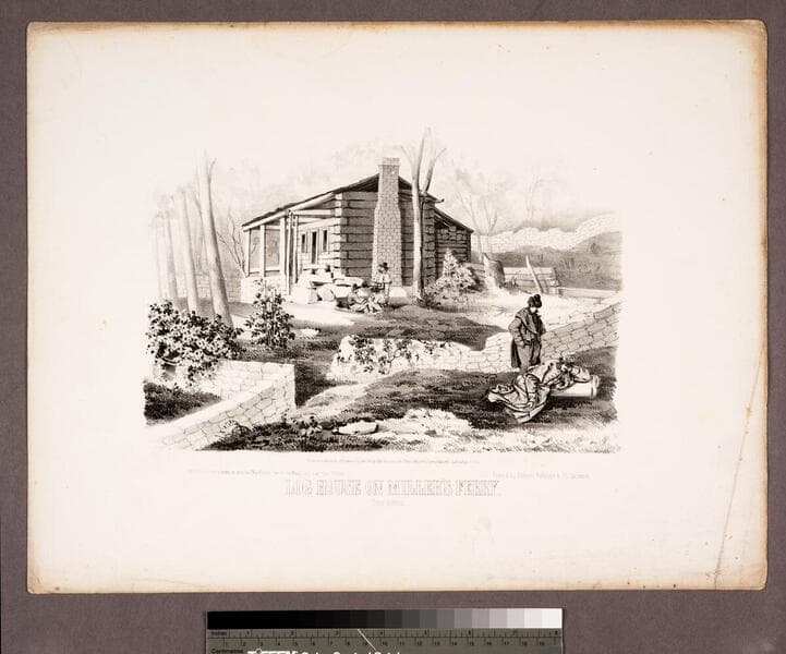 - Image of a log cabin with low stone walls and trees nearby at Camp Anderson located in West Virginia during the American Civil War; five Union soldiers in various states of repose visible outside the cabin.