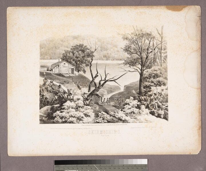 - Image of a skirmish between Union and Confederate soldiers near New River in West Virginia during the American Civil War; men shoot from behind a low stone wall and under cover of brush at enemies below; log cabin visible along bank of river.