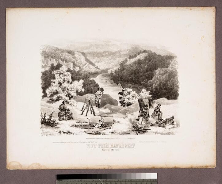 - Image of a group of soldiers lounging near a fire and in various states of repose on a rocky outcropping overlooking New River in West Virginia during the American Civil War; rifles with bayonets stacked against each other upright near seated men; river flowing through a forest landscape visible in background below.