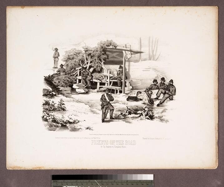 - Image of several soldiers on the road from Camp Anderson in West Virginia during the American Civil War; the men sit in various states of repose on the ground or under a wood structure for shade.