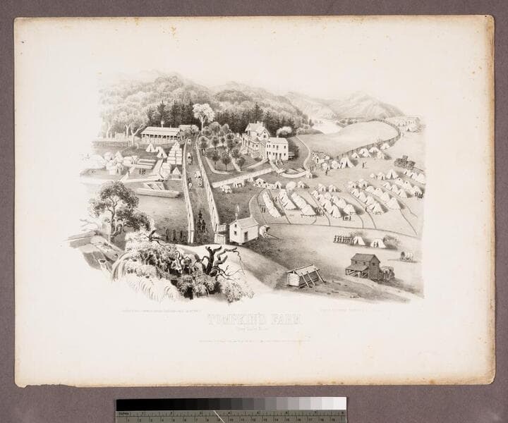 - Image of an elevated view of Tompkin's Farm in West Virginia used as a military camp during the American Civil War; tents are visible spread out over fields on either side of a central roadway; farmhouse and other buildings also visible on the property.