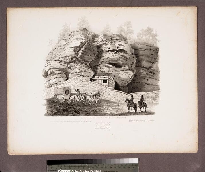 - Image of Union soldiers on horseback and leading a team of horses pulling a covered wagon along a road next to a large rock formation near Gauley Ferry, West Virginia, during the American Civil War.