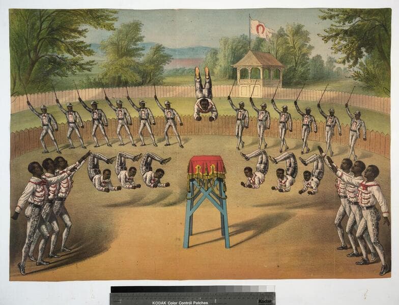 Image of three unattached panels with images of blackface actors, acrobats, and dancers performing outdoors and consisting of male and female costumed actors performing a theatrical scene, thirteen identically dressed acrobats in midair doing flips in unison, and six couples dancing.