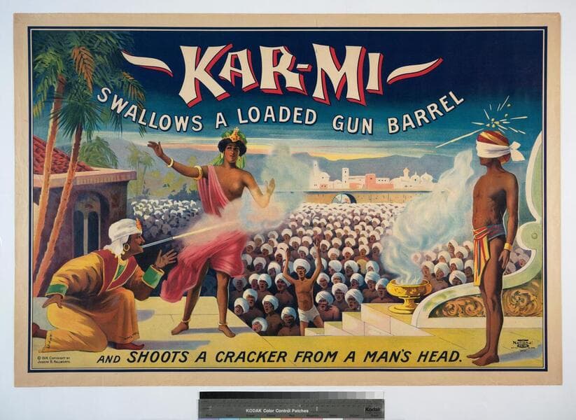 Kar-mi : swallows a loaded gun barrel : and shoots a cracker from a man's head