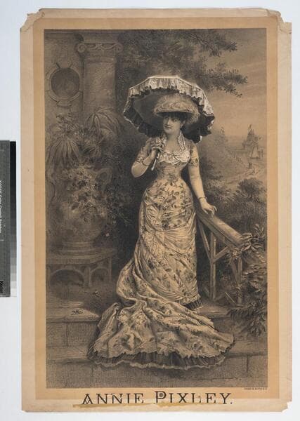 Image of a head-and-shoulders portrait of American actor Annie Pixley in character wearing a torn blouse and red neckerchief; with a fragment of a date sheet for a show at the Worcester Theatre; the poster presumably depicts Pixley as the title character in the drama "M'liss, the Child of the Sierras" based on a story by Bret Harte.