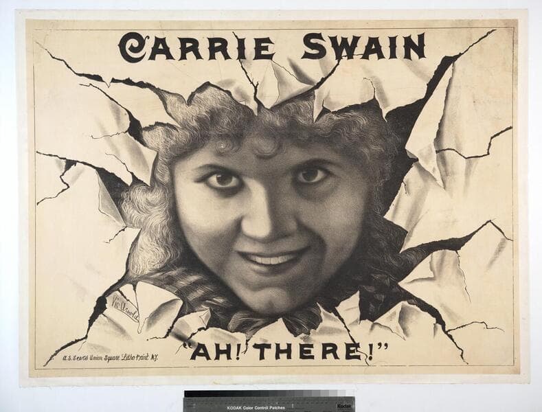 Image of the smiling face of American actor Carrie Swain bursting through torn paper; with fragment of flowers visible at top; the poster presumably advertises Swain in "Cad, the Tomboy" by Leonard Grover.