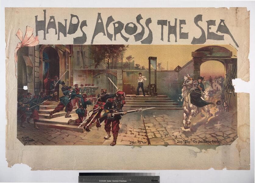 Image of British cavalry in red military jackets and helmets charging on horseback with swords in the air; the poster advertises the melodrama "The Soudan," first performed in England under the title "Human Nature."