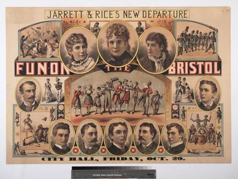 Image of a central image of a paddle steamer called the Bristol with people on deck and flags flying; a vignette of a ship's captain standing in the "B" of the title text and looking through a spy glass at top center, a vignette of a full-length caricature portrait of a naval officer standing with a sword at bottom left and a vignette of a cartoon of the officer getting sea sick while the ship captain looks on and asks, "Sick Sir?" and the officer responds, "You don't suppose I'm doing this for fun do you?" at bottom right; the poster advertises the comedy-musical show "Fun on the Bristol, Or a Night on the Sound" managed by Edward E. Rice and Henry C. Jarrett.