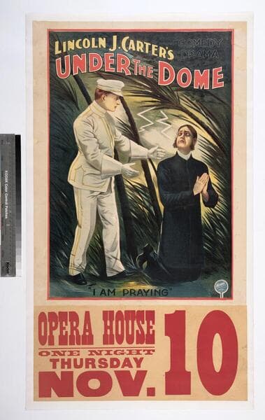 Image of a white man in a suit praying at the foot of a newly dug grave under a tree with three African American men standing in the background with a horse and one, presumably the gravedigger, holds a shovel; the poster advertises the Harmount Company production of "Uncle Tom's Cabin" based on the novel by Harriet Beecher Stow.