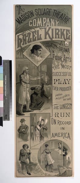 Image of a central image of a full-length portrait of a man wearing glasses and holding one hand out towards the viewer and a hat in the other; surrounded by six vignettes of scenes consisting of a man standing on a chair about to hang himself with a noose; a man hitting another in a fist fight; a man falling out of a window; two women fighting each other; women attempting to restrain a violent man; and a man and a woman sitting on a bench and concealed by an umbrella who are presumably embracing; the poster advertises the comedy "The Professor" written by William Gillette.