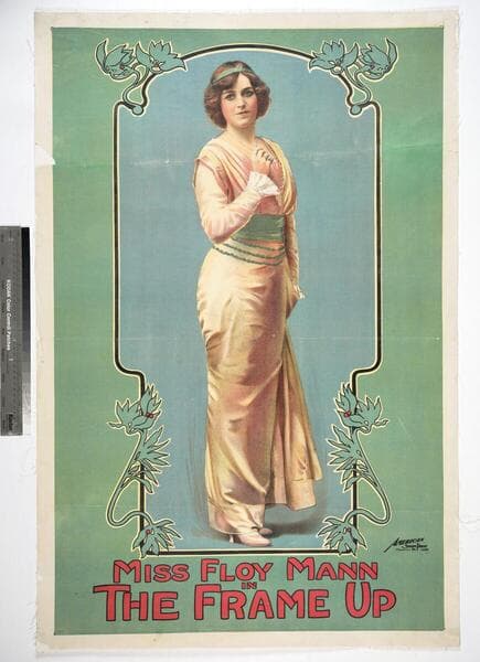 Image of a head-and-shoulders portrait of American burlesque performer Sophie Worrell Knight in formal dress and wearing a large hat and framed by an Art Nouveau-style floral border; the poster advertises the musical and burlesque show "Over the Garden Wall" by Scott Marble produced by Knight and her husband, German comedian George S. Knight.