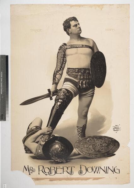 Image of American actor Robert Downing, in costume with a shield and sword, performing as the Roman gladiator Spartacus and standing in the center arena of a coliseum before the Emperor, with other gladiators approaching and a kneeling woman crying on his arm; the poster advertises the tragedy "The Gladiator."