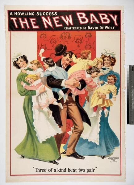 Image of the legs of three men, apparently disconnected from the top halves of their bodies, floating out open windows from a room containing a vase with palm fronds and a chair; the poster advertises the comedy "The New Baby" adapted by English actor and stage manager Arthur Bourchier from the German play "Der Rabenvater" by H. Fischer and Joseph Jarn.