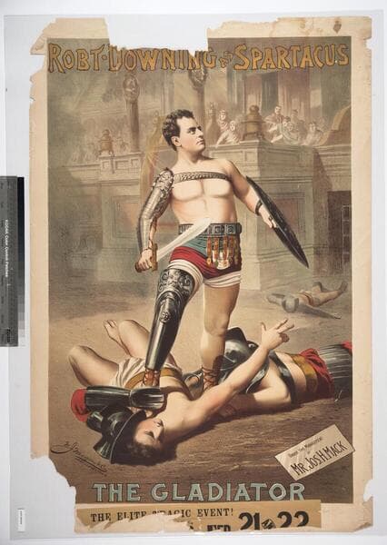 Image of American actor Robert Downing, in costume with a shield and sword, performing as the Roman gladiator Spartacus and standing in the center arena of a coliseum before the Emperor, with other gladiators approaching and a kneeling woman crying on his arm; the poster advertises the tragedy "The Gladiator."